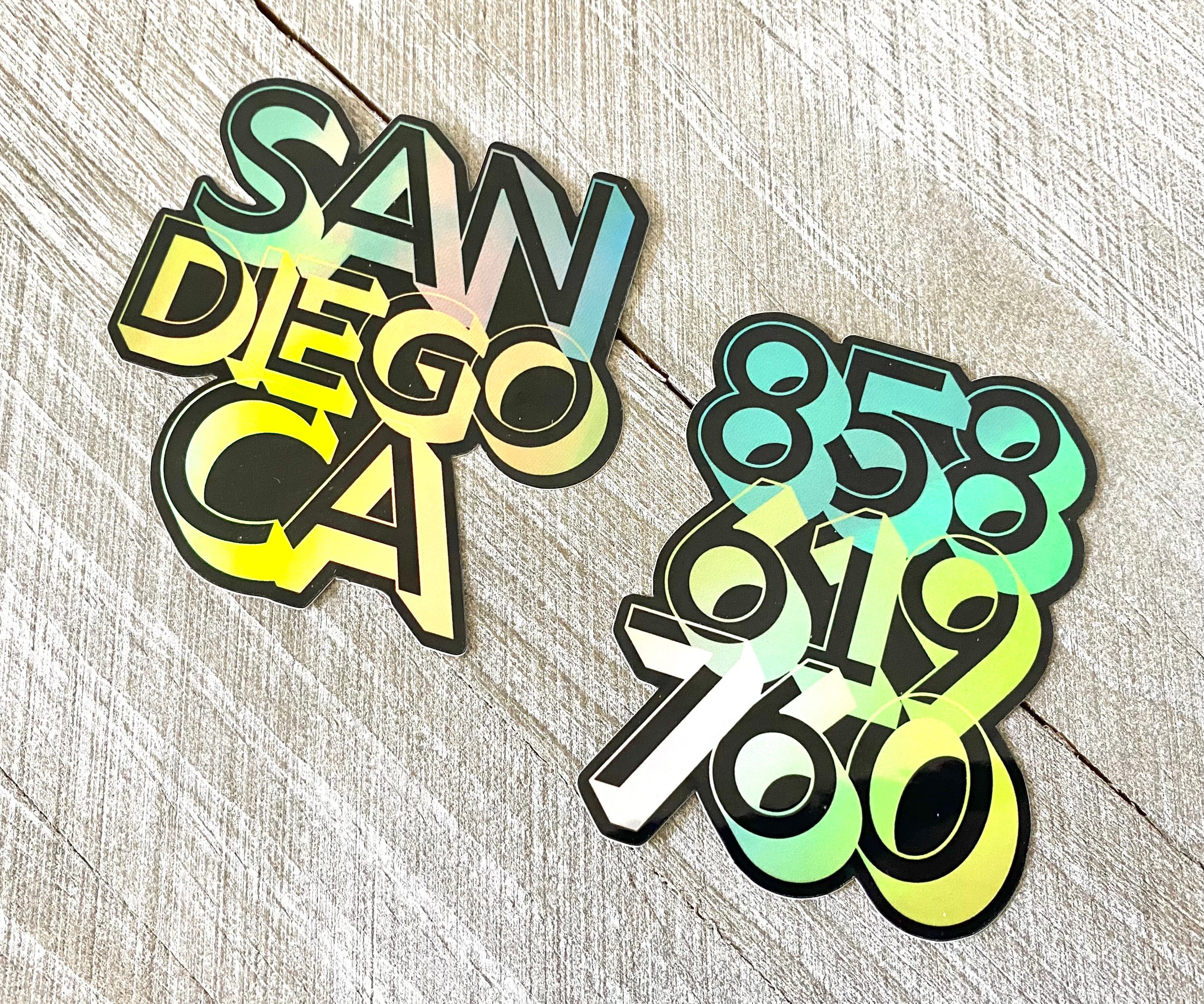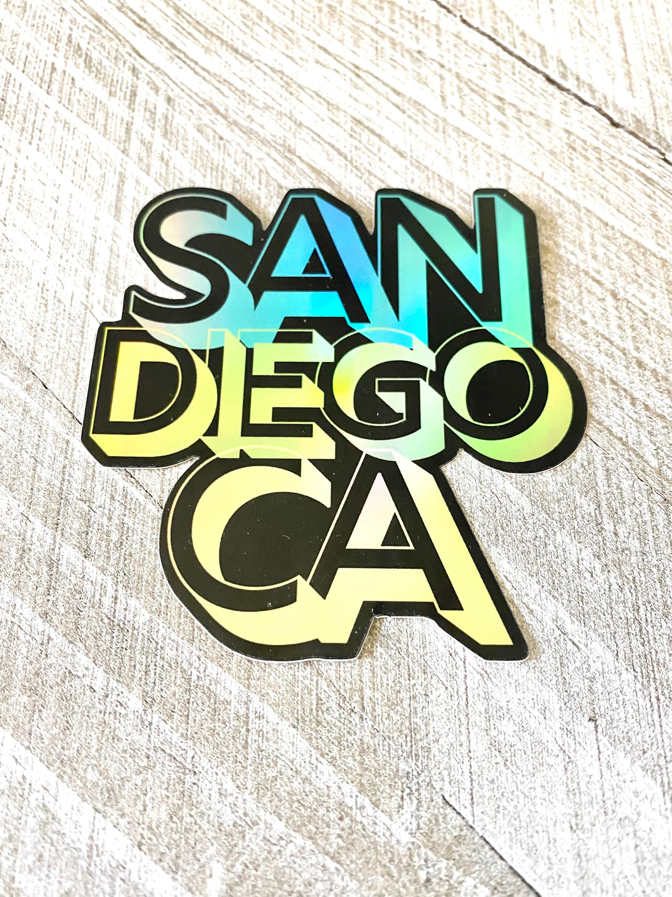 - San Diego Holographic “SAN DIEGO CA” sticker in blue, green, and yellow lettering